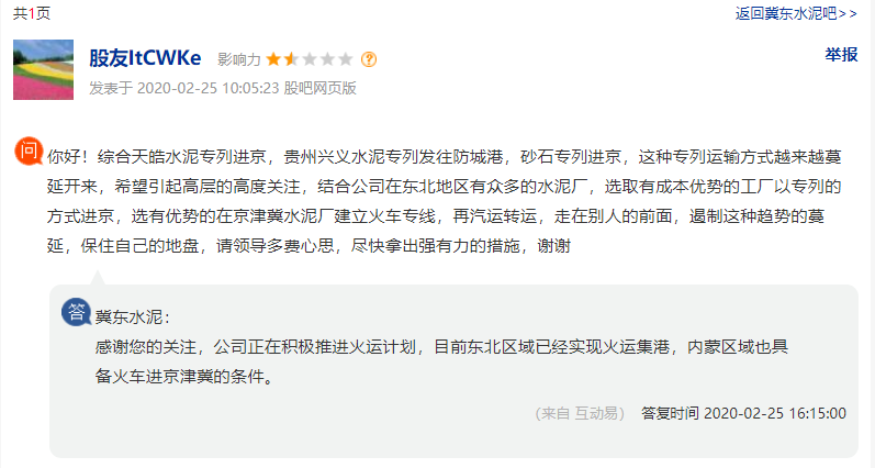 冀东水泥回复称,正在积极推进火运(铁路运输)计划,目前东北区域已经实现火运(铁路运输)集港,内蒙区域也具备火车进京津冀的条件。