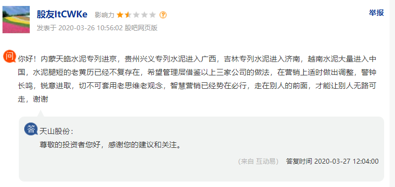 同期有投资者在上市平台向天山股份董秘提问并建议说:内蒙天皓水泥专列进京,贵州兴义专列水泥进入广西,吉林专列水泥进入济南,越南水泥大量进入中国,水泥腿短的老黄历已经不复存在,希望管理层借鉴以上三家公司的做法,在营销上适时做出调整,警钟长鸣,锐意进取,切不可套用老思维老观念,智慧营销已经势在必行,走在别人的前面,才能让别人无路可走。