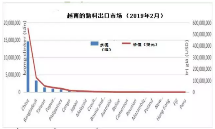 2019年,中国大陆是越南熟料水泥的主要市场占其市场份额的40.46%,达到631万吨,价值248.19百万美元。