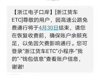 今天,很多浙江ETC用户卡友收到同样一条短信,短信的内容大致是:因高速公路免费通行将于4月30日结束,请大家保持账户余额充足。