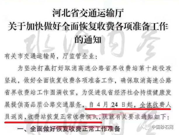 据中国砂石协会和中国砂石网了解,日前,河北省交通运输厅发布《关于加快做好全面恢复收费各项准备工作的通知》称为坚决打赢打好取消高速公路省界收费站第十战役攻坚战,做好全面恢复收费各项准备工作,确保取消高速公路省界收费站工作圆满收官,为促进全省经济社会持续健康发展提供高品质公路交通服务,自4月24日起,全体收费人员返岗,收费站恢复正常收费模式。
