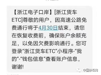 近日,很多浙江ETC用户收到同样一条短信,短信的内容大致是:因高速公路免费通行将于4月30日结束,请大家保持账户余额充足。