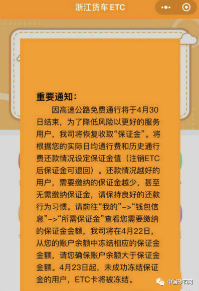 同日,浙江货车ETCUED(中国)发布通知,表示高速公路免费通行将于4月30日结束。