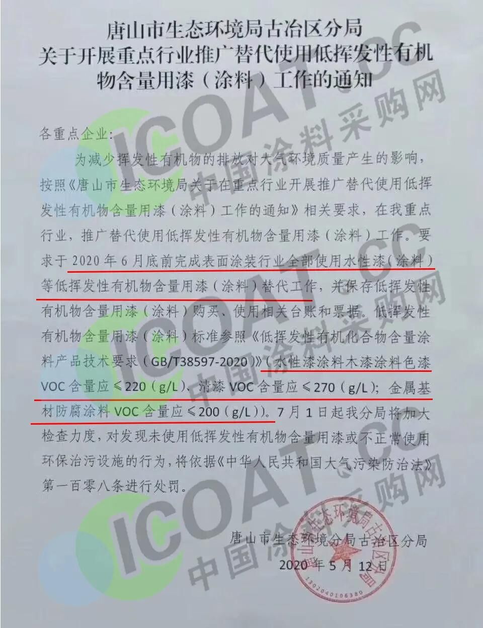 为减少挥发性有机物的排放对大气环境质量产生的影响,按照《唐山市生态环境局关于在重点行业开展推广替代使用低挥发性有机物含量用漆(涂料)工作的通知》相关要求,在我重点行业,推广替代使用低挥发性有机物含量用漆(涂料)工作,要求于2020年6月底前完成表面涂装行业全部使用水性漆(涂料)等低挥发性有机物含量用漆(涂料)替代工作,并保存低挥发性有机物含量用漆(涂料)购买、使用相关台账和票据。低挥发性有机物含量用漆(涂料)标准参照《低挥发性有机化合物含量涂料产品技术要求(GB/T38597-2020)》(水性漆涂料木漆涂料色漆VOC含量应≤220(g/L)、清漆VOC含量应≤270(g/L);金属基材防腐涂料VOC含量应≤200(g/L))。 7月1日起我分局将加大检查力度,对发现未使用低挥发性有机物含量用漆或不正常使用环保治污设施的行为,将依据《中华人民共和国大气污染防治法》第一百零八条进行处罚。 违反本法规定,有下列行为之一的,由县级以上人民政府生态环境主管部门责令改正,处二万元以上二十万元以下的罚款;拒不改正的,责令停产整治:(一)产生含挥发性有机物废气的生产和服务活动,未在密闭空间或者设备中进行,未按照规定安装、使用污染防治设施,或者未采取减少废气排放措施的;(二)工业涂装企业未使用低挥发性有机物含量涂料或者未建立、保存台账的;(三)石油、化工以及其他生产和使用有机溶剂的企业,未采取措施对管道、设备进行日常维护、维修,减少物料泄漏或者对泄漏的物料未及时收集处理的;(四)储油储气库、加油加气站和油罐车、气罐车等,未按照国家有关规定安装并正常使用油气回收装置的;(五)钢铁、建材、有色金属、石油、化工、制药、矿产开采等企业,未采取集中收集处理、密闭、围挡、遮盖、清扫、洒水等措施,控制、减少粉尘和气态污染物排放的;(六)工业生产、垃圾填埋或者其他活动中产生的可燃性气体未回收利用,不具备回收利用条件未进行防治污染处理,或者可燃性气体回收利用装置不能正常作业,未及时修复或者更新的。
