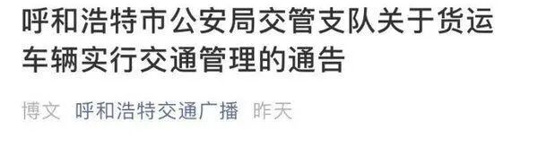 日前,呼和浩特市公安局交管支队发布通告表示:6月28日起,对货运车辆采取交通管理措施。
