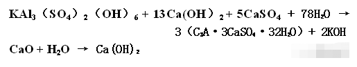 现在的膨胀剂一般是双膨胀源:硫铝酸盐和氧化钙!下面公式是反应膨胀的机理,从这里可以看出氧化钙与水生成氢氧化钙,体积膨胀,硫铝酸盐与氢氧化钙、硫酸钙和水又生成带32个结晶水的水化硫铝酸钙,也就是钙矾石,水泥水化物的一种