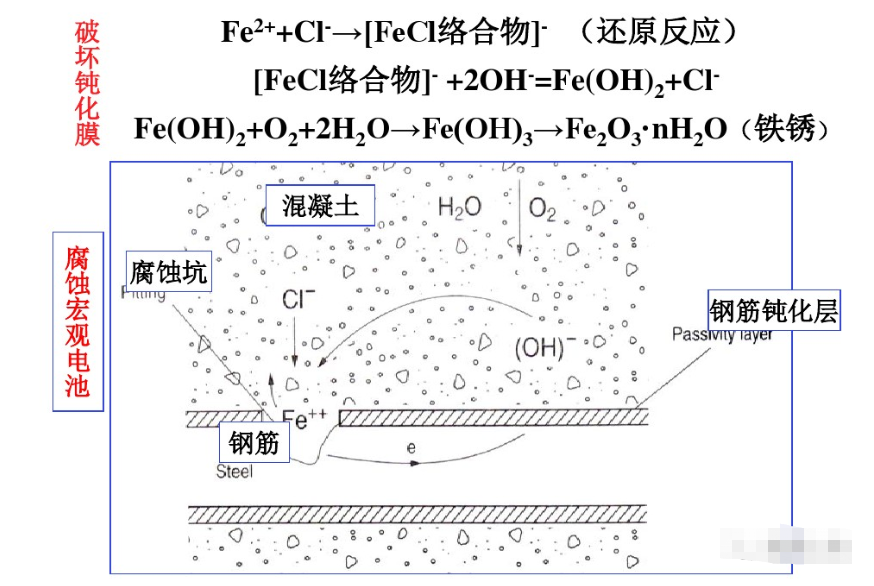 沿海地区主要的腐蚀因素就是硫酸盐、氯离子、镁离子等,对有碱活性骨料,还要考虑加钾离子和钠离子。其中,让大家最关注的就是氯离子对钢筋的锈蚀作用。
