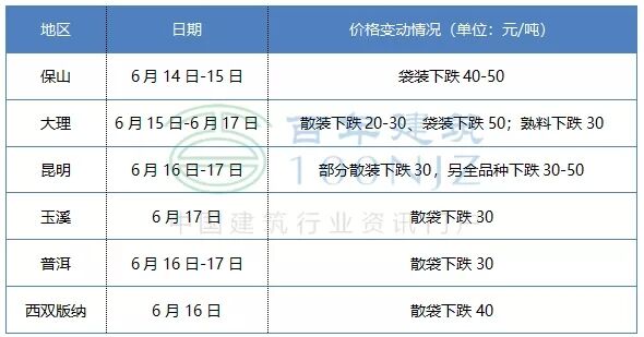 17日云南玉溪、大理地区部分品牌水泥价格下跌30元/吨,雨水天气市场需求不佳,价格回落。