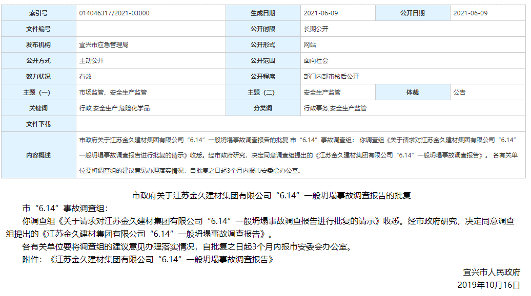 2021年6月9日,江苏省宜兴市人民政府官网发布《关于江苏金久建材集团有限公司“6.14”一般坍塌事故调查报告的批复》,对一起因筒库坍塌造成2死1伤的事故进行通报。
