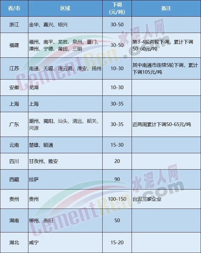 福建省福州、南平、龙岩、泉州等多地下调30-50元/吨