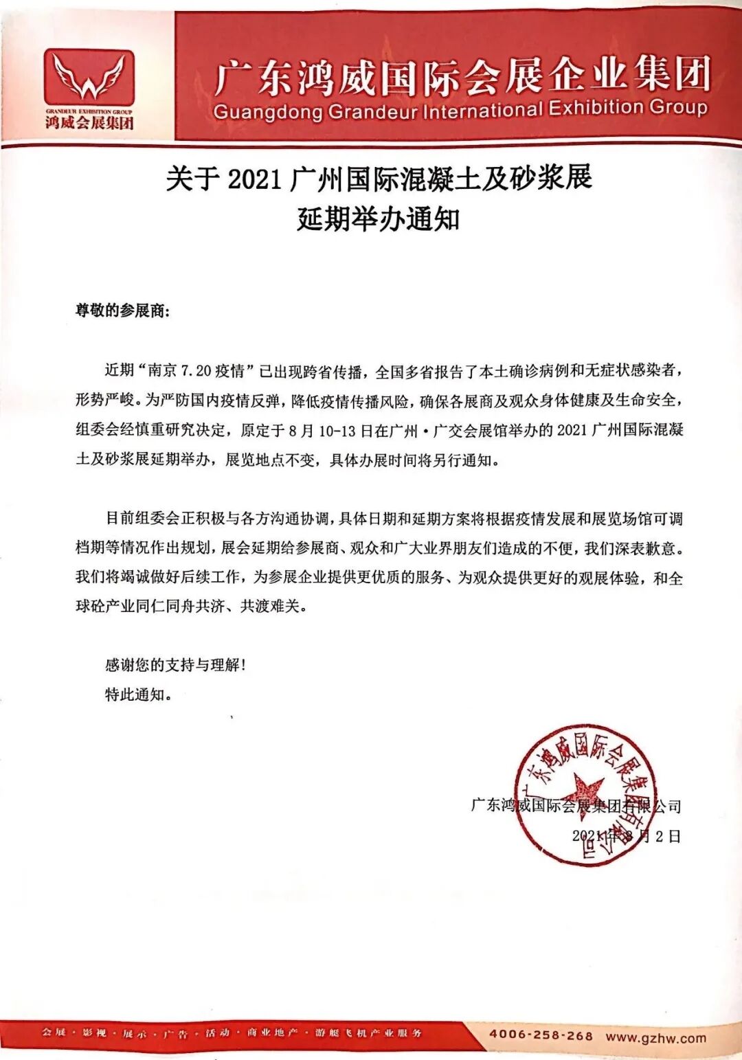 由于当前国内多地出现新型冠状病毒肺炎新增确诊病例、中高风险地区不断增加的疫情严峻形势影响,为全力配合做好疫情防控工作,避免大规模聚集和降低疫情传播风险,保障参展商、观众及工作人员健康安全,维护参展单位权益,确保展会效果,组委会经慎重研究决定,原定于8月10-13日在广州·广交会展馆举办的2021广州国际ued网站及砂浆展延期举办,展览地点不变,具体办展时间将另行通知。