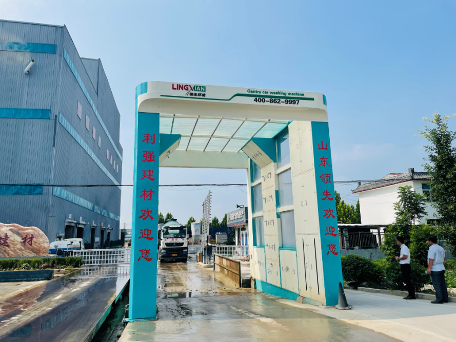 在搅拌站门口设置洗车机,进出车辆分别从侧、顶、底部360度无死角冲洗,保证了进出车辆的整洁,避免了对路面的污染,同时防止了车辆行驶产生扬尘污染。