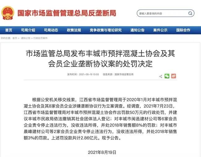 8月18日,国家市场监管总局发布通报,江西省市场监督管理局对丰城市预拌ued网站协会及其会员企业垄断协议一案,合计罚没约2.86亿元。