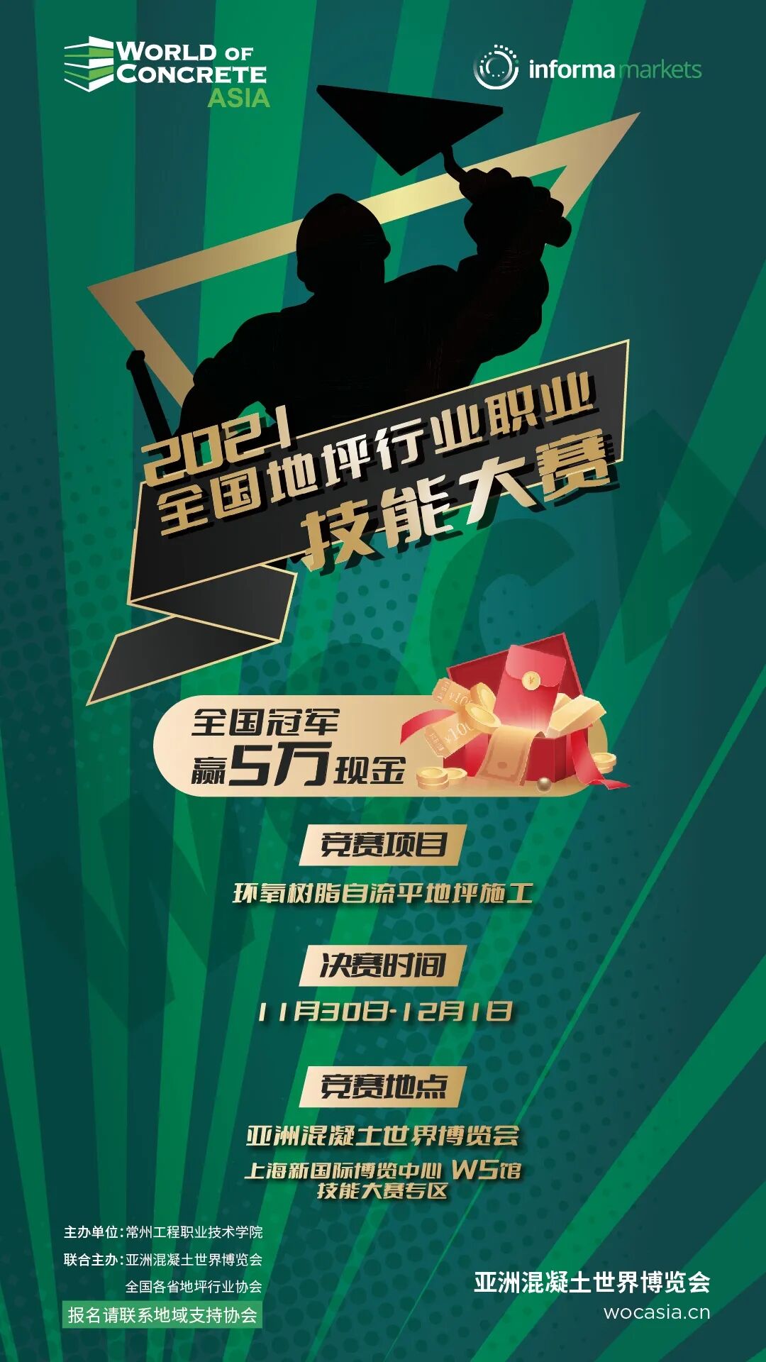 由常州工程职业技术学院、WOCA亚洲ued网站世界博览会联合主办,地坪产业学院和各省地坪行业协会协办的“2021年全国地坪行业职业技能大赛”,将在2021年亚洲ued网站世界博览会展会现场举行,全国冠军将获得五万现金!