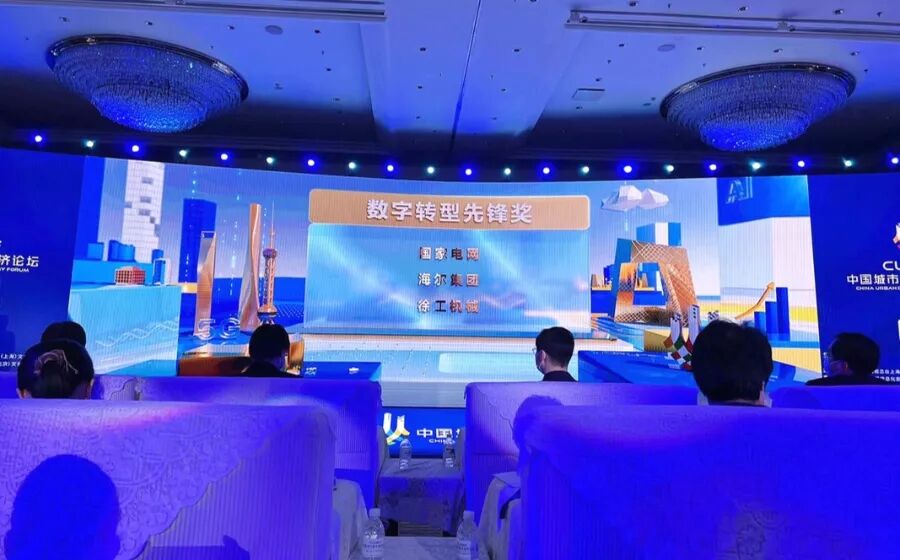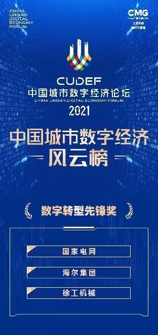 论坛上,《中国城市数字经济风云榜》荣耀发布。榜单包括“城市数字经济竞争力综合排名”,同时多项重磅奖项发布,“数字赋能先锋奖”“数字转型先锋奖”“数字应用方案奖”。徐工机械与国家电网、海尔集团同时荣获“数字转型先锋奖”,成为唯一入选的工程机械制造企业。