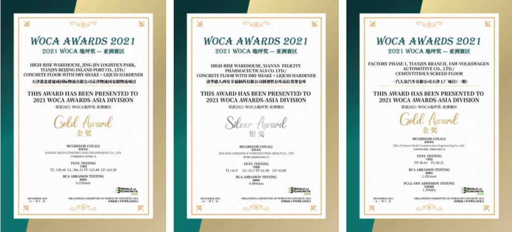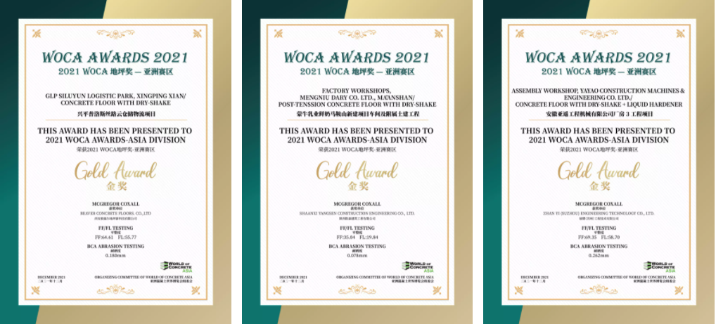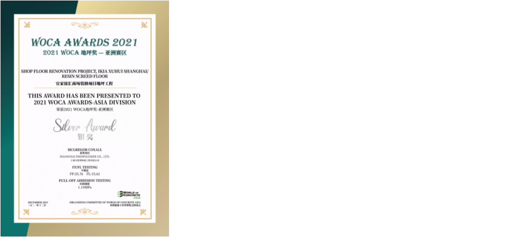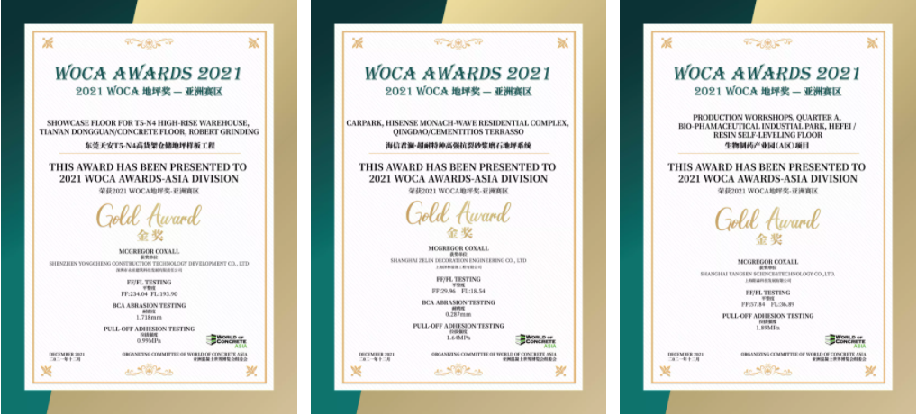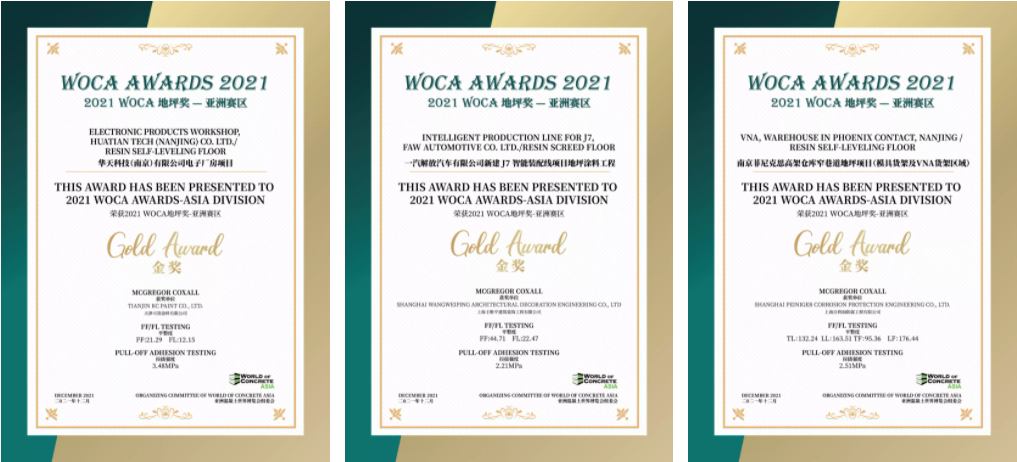 经过对多个项目进行地坪检测,三大类中13个优秀项目获得了2021 WOCA 地坪奖(WOCA AWARDS)-亚洲赛区的荣誉。