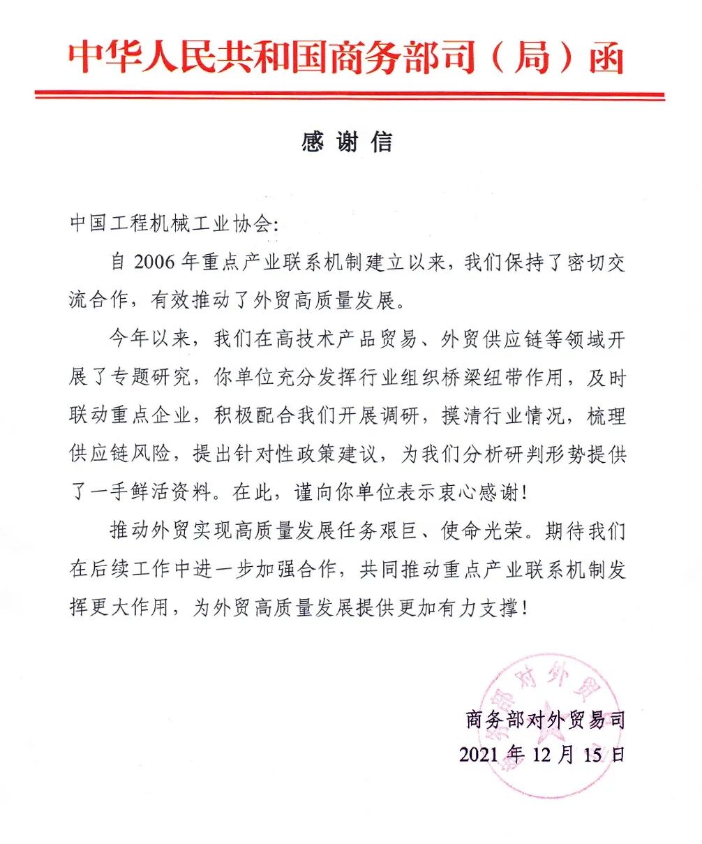 近日,商务部对外贸易司致函中国工程机械工业协会,就协会今年以来,积极配合商务部对外贸易司在高技术产品贸易、外贸供应链等领域开展了专题研究,收集、整理了大量的行业外贸进出口情况,受到了高度的肯定。并指出,协会充分发挥行业组织桥梁纽带作用,及时联动重点企业,积极配合商务部对外贸易司开展调研,摸清行业情况,梳理供应链风险,提出针对性政策建议,为商务部对外贸易司分析研判形势提供了一手鲜活资料。在此,谨向协会表示衷心感谢!
