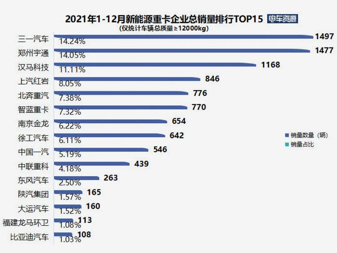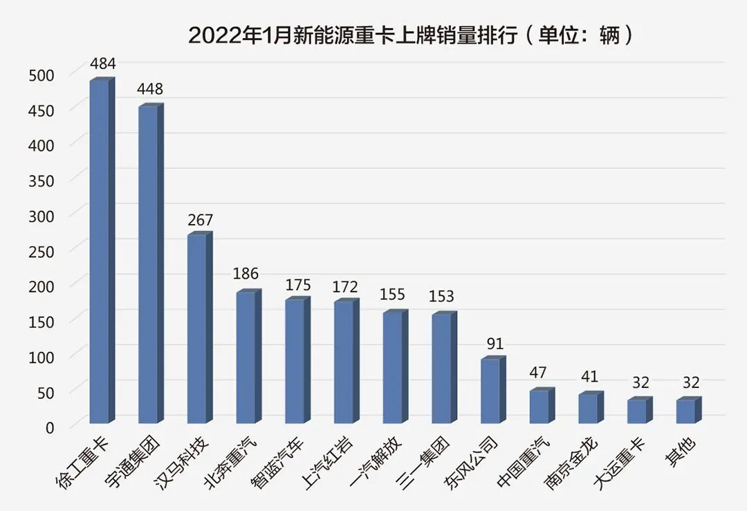 特别是在企业销量排行榜上,表现最为抢眼的并不是传统重卡制造商,而是工程机械企业跨行业进军重卡行业的典型代表——三一汽车与徐工汽车:三一新能源重卡2021年累计销量达到1497辆,同比大增1621%,市场份额达到14.33%,较上年同期提升了11个百分点;徐工在2022年1月21.2%的月度占有率火热开局,问鼎新能源重卡2022首月销冠。