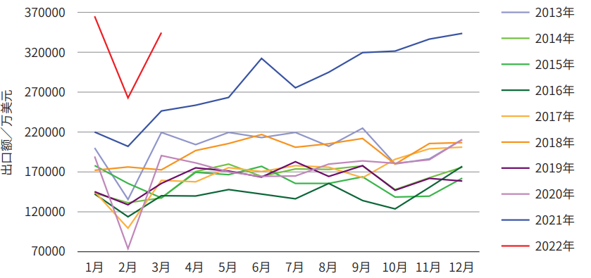 根据海关数据整理,2021年1-3月我国工程机械进出口贸易额为105.08亿美元,同比增长36%。其中进口金额7.85亿美元,同比下降22.8%;出口金额97.23亿美元,同比增长45%,贸易顺差89.38亿美元,同比增加32.49亿美元。2022年1-3月各月进出口情况如表1所示,2013年-2022年月度出口金额如图1所示。