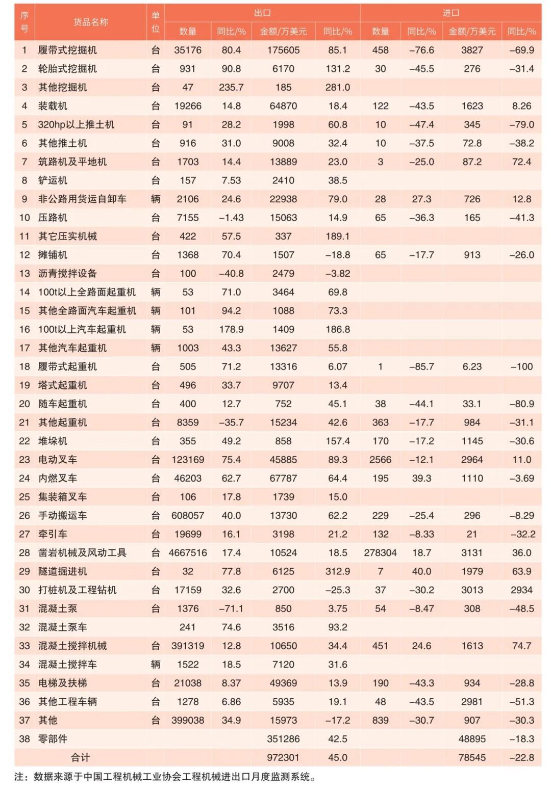 出口方面,累计出口整机62.1亿美元,同比增长46.4%占出口总额的63.9%;零部件出口35.13亿美元,同比增长42.5%,占出口总额的36.1。1-3月出口额增加的主要整机有:履带挖掘机、叉车、非公路用自卸车、电梯及扶梯、手动搬运车等。出口额减少的主要有:打桩机及工程钻机、摊铺机等。