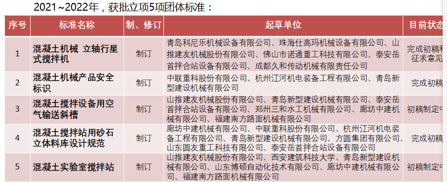 以市场需求为导向,围绕产品链,今年重点从“关键部件/系统,新材料、新能源,智能产品、智能互联”方1立项团体标准,引导和服务混凝十机械行、发展。 2022年拟申请团体标准立项10项以上。