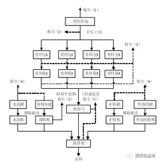 粉尘(5)是各种粉料经过称量后进入搅拌机和骨料经过斜皮带提升进入预加斗再进入搅拌机过程中产生的大量粉尘混合物。