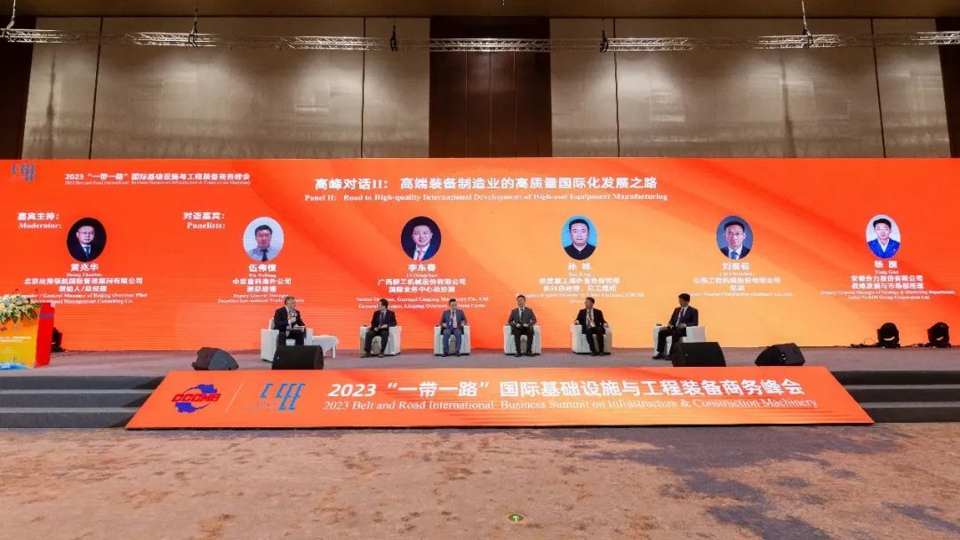 第二场高峰对话由北京出海领航国际管理顾问有限公司创始人、总经理黄兆华主持,邀请中联重科、广西柳工、山推、铁建重工、安徽合力公司高管,围绕“高端装备制造业的高质量国际化发展之路”展开对话交流,对话嘉宾聚焦后疫情时代国际基础设施发展的机遇,分享工程装备制造业高质量发展的经验和建议。