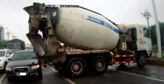 由于连日来的大雨,23日下午13时50分许,福建晋江市晋光路灯控路口,一辆搅拌车刹车打滑,车头冲上绿化带撞了电子警察监控杆,之后车身打横,车尾擦撞了一旁停车等红灯的奥迪小车,两人当街发生争执。