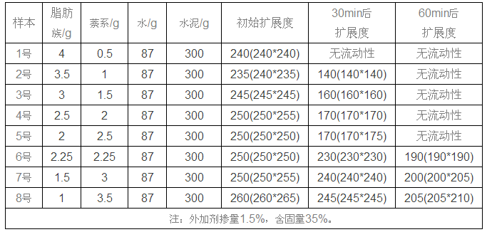 笔者将通过脂肪族与萘系复配,探讨与淮南“海螺牌”水泥的适应性实验,对比两者的优略,从不同的比例中找出效果理想且经济实用的最优组合。本次实验所用的淮南“海螺牌”水泥的熟料使用新型干法旋窑生产P.O42.5普通硅酸盐水泥,其中三氧化硫含量为2.09%;氧化镁含量为1.91%;氯离子含量为0.016%;混合材品种为碎屑+煤矸石,掺量12.53%;石膏为脱硫石膏,掺量4.97%,水泥初凝170min,终凝220min。脂肪族为某单位生产的普通脂肪族外加剂,固含量为35%,减水率24%,密度1.195g/cm3。萘系为袋装萘粉,稀释到含固量为35%(含固量与脂肪族的相同,方便做对比实验)。脂肪族外加剂(免加热型)在合成过程中使用氢氧化钠提供热源,导致脂肪族外加剂含碱量相对较高;而萘系在合成过程中,首先加入浓硫酸磺化,在水解中和反应,因而萘系外加剂中硫酸根离子含量相对较高。