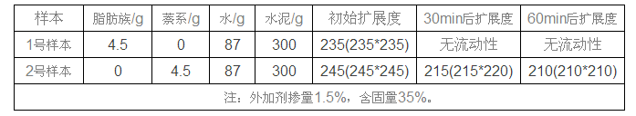 从表1可以明显看出,等量的脂肪族和萘系对“海螺牌”水泥的打开都无问题,初始差距不大。而经时损失方面,1号样本损失较快;2号样本效果非常理想,由此可以判断2号样本即萘系对“海螺”水泥的适应性较好。