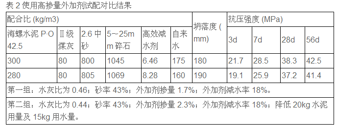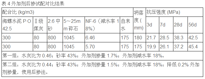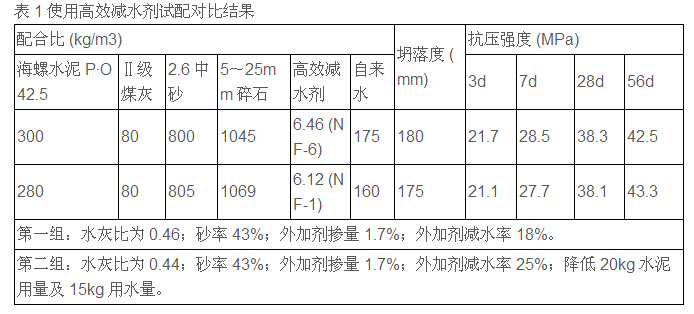 试配对比结果分析:其他材料相同,使用高效减水剂(NF-1),保持砂率及外加剂掺量不变,适当降低水泥用量及用水量,使水灰比降低,在相同的坍落度下28d 及 56d 强度相近并降低了成本。