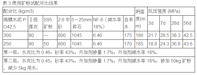 试配对比结果分析:在材料相同的情况下,用一部分矿粉代替部分水泥用量,降低部分水灰比及用水量,在同一坍落度下,最终强度相近并降低了部分成本。