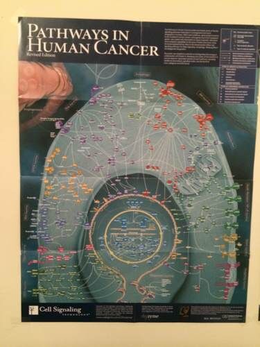 这是我老婆贴在家里的一张海报,里面的每一个箭头、每一根线都是好几篇或者好几十篇论文,很多都是 CNS,甚至有一些是诺贝尔奖得主的成果。这是一个很直观的科学的图形化表述,一门科学就是由这些千千万万的点点滴滴组成的。