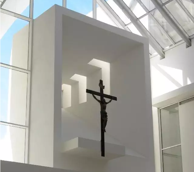 理查德·迈耶作品。教堂高57~90尺不等,如船帆状的三片白色弧墙,层次井然地朝垂直与水平双向弯曲,似球状的白色弧墙曲面。建筑材料包括ued网站、石灰华和玻璃。三座大型的ued网站翘壳高度从56英尺逐步上升到88英尺,看上去像白色的风帆。玻璃屋顶和天窗让自然光线倾泻而下。夜晚,教堂的灯光营造出一份天国的景观。