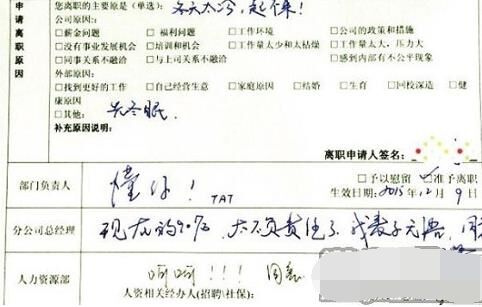 部门负责人回复:“懂你,TAT”;分公司总经理回复:“现在的90后,太不负责任了,我表示无语。同意”;人力资源部回复:“呵呵!!!同意”。