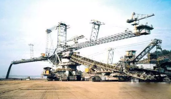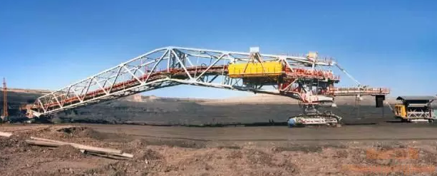 排土能力达到34000吨/小时,臂长超过120米。皮带排土机为移动式连续工作的排料设备,它们将来自可移动梯段皮带运输机的物料排卸在料堆上,借助皮带转载车和皮带滑行转载车将物料输送到排土机。排土机有能力堆高低地、作为行驶路面的平盘,以便随后用做新采区的卸料、堆高。除此之外,还可以使用一部皮带排土机为可移动梯段皮带运输机堆起一个高平面。说白了,它就是一个堆土的设备喽~
