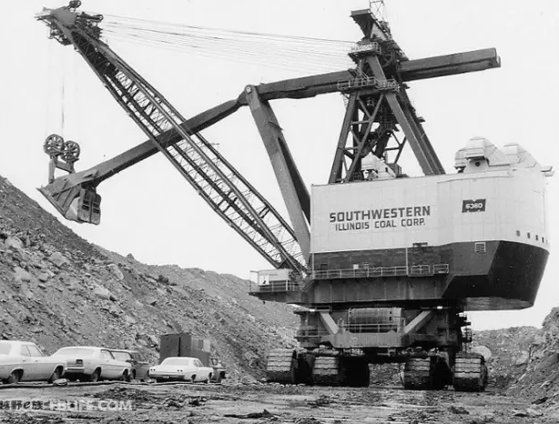 这个电铲1965年问世,组装它花了约两年时间,最终的建造费用在当时超过1500万美元,在美国Southwestern Illinois的“Captain”露天煤矿使用,其高度相当于21层楼,使用7000V的高压电,行走装置为8条履带,斗臂长度为41米,最大挖掘高度67.2 m,是迄今全球最大的电铲,因火灾毁损于1992年爆破拆解,一生的挖掘量达到6亿2千万方。没有见证这一奇迹真是遗憾呐~