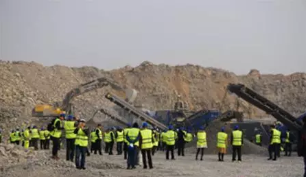 工地参观也是此次论坛的重要环节。全体嘉宾来到山东淄博依厂矿业的石灰石采石场,近距离了解克林曼移动式破碎筛分设备的性能及生产出的骨料质量。