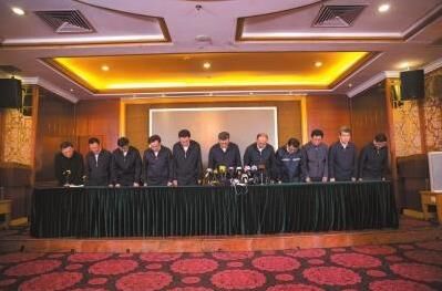 25日,深圳市委书记马兴瑞(左六)和市长许勤(左七)等深圳市和光明新区领导在发布会上鞠躬道歉。
