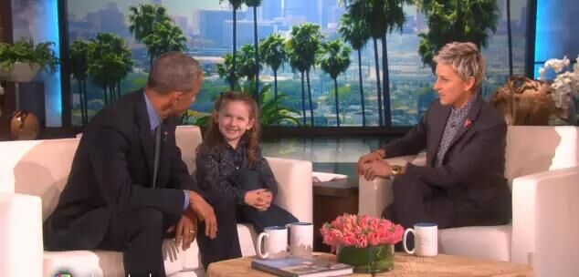在本次节目中,主持人狄珍妮(Ellen DeGeneres)首先欢迎6岁的「总统专家」汉斯利(Macey Hensley)出场。这名可爱的小女孩挥着手走出来,先后拥抱奥巴马和狄珍妮。