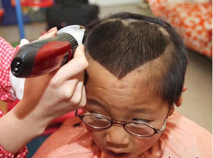 一个孩子正在“剃喜头”。