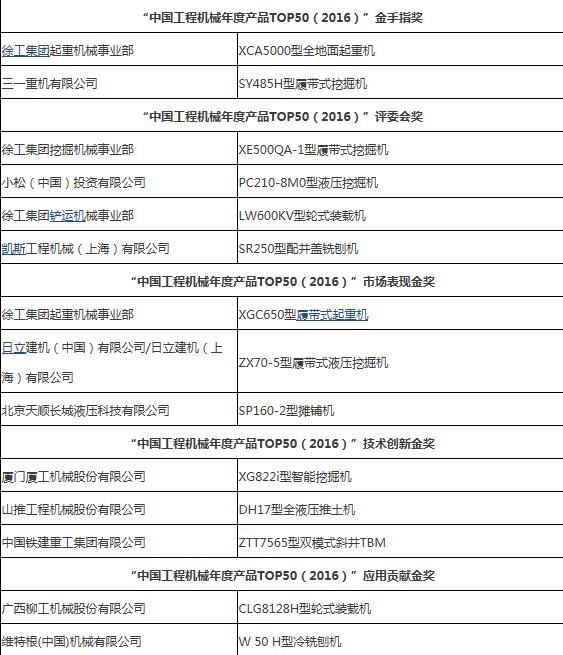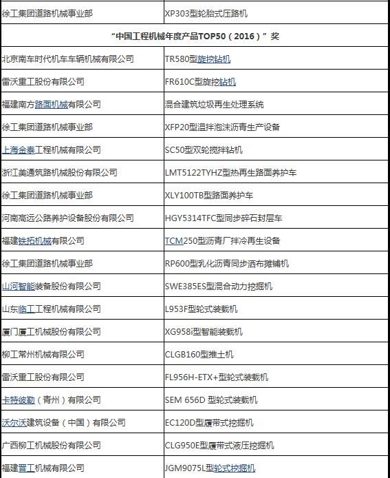 2016年3月31日,“2016工程机械产品发展(北京)论坛暨中国工程机械年度产品TOP50颁奖典礼”在北京隆重举行。来自中国工程机械工业协会及下属分支机构、国家工程机械质量监督检验中心、相关行业协会以及工程机械制造企业、施工企业、科研机构、高校、新闻媒体的200余位嘉宾参加了这次年度盛会。