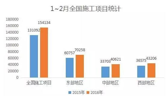 今年1~2月,全国施工项目154134个,比去年同期增加23042个。其中,东部地区施工项目70258个,增加9501个;中部地区施工项目40621个,增加6918个;西部地区施工项目43206个,增加6631个。