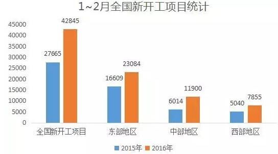 今年1~2月,全国新开工项目42845个,比去年增加15180个。其中,东部地区新开工项目23084个,增加6475个;中部地区新开工项目11900个,增加5886个;西部地区新开工项目7855个,增加2815个。