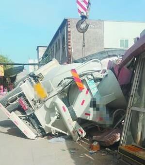 一辆江淮标志的白色搅拌车在吊车的牵引下斜靠在墙上。据目击者介绍,事发下午1时左右,当时搅拌车正在倒车,突然车右后轮下方的路面塌陷,搅拌车失去平衡,向右方翻倒,有两名路过此地的行人躲闪不及,被压在了车身下。