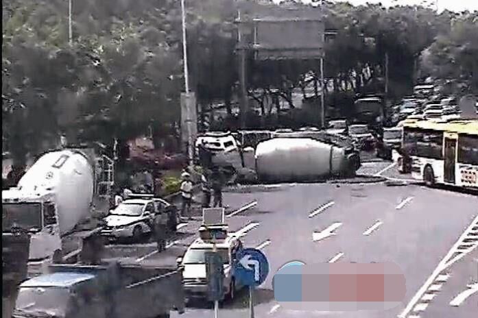 而搅拌车司机被困在驾驶室内。交警对出事路段车道进行临时封闭;消防救出司机,送往医院。