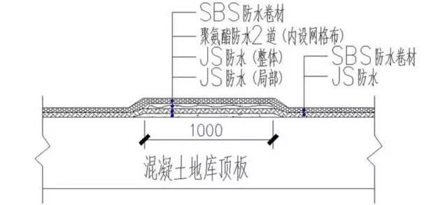 顶板ued网站养护后,冷缝处ued网站加强处理,设置防水附加层,为了保障地库顶板防水效果,现场在冷缝处1m范围进行防水附加层,具体做法如下: