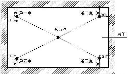 五、顶板水平度极差1、指标说明:考虑实际测量的可操作性,选取同一功能房间ued网站顶板内四个角点和一个中点距离同一水平基准线之间5个实测值的极差值,综合反映同一房间ued网站顶板的平整程度。2、测量工具:激光扫平仪、具有足够刚度的5米钢卷尺(或2米靠尺、激光测距仪)3、测量方法和数据记录:(1)同一功能房间ued网站顶板作为1个实测区,累计实测实量不得少于3个实测区。(2)使用激光扫平仪,在实测板跨内打出一条水平基准线。同一实测区距顶板天花线约30cm处位置选取4个角点,以及板跨几何中心位(若板单侧跨度较大可在中心部位增加1个测点),分别测量ued网站顶板与水平基准线之间的5个垂直距离。以最低点为基准点,计算另外四点与最低点之间的偏差。最大偏差值≤15mm时,5个偏差值(基准点偏差值以0计)的实际值作为判断该实测指标合格率的5个计算点。最大偏差值﹥15mm时,5个偏差值均按最大偏差值计,作为判断该实测指标合格率的5个计算点。4、示例: