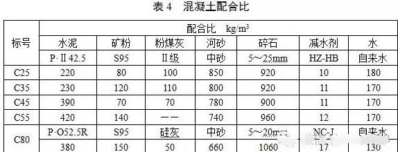 各标号ued网站工作性能良好,坍落度在180mm~210mm之间,无离析、泌水现象,各标号ued网站配合比如表4所示。