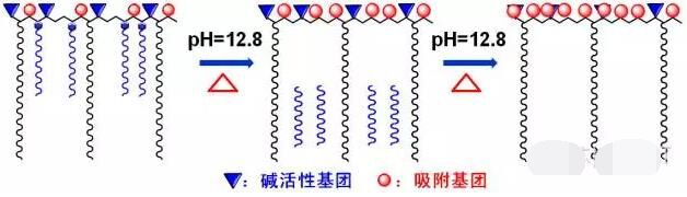 其次,快速水解型聚醚单体应用,由于水泥水化前期速度较快,自由水消耗较多,在低自由水量前提下,通过调控水解释放速率与侧链脱落、水化掩埋之间的平衡,既有效降低前期流动度损失,又避免后期反向增长。快速水解提供分散动力作用示意图如下: